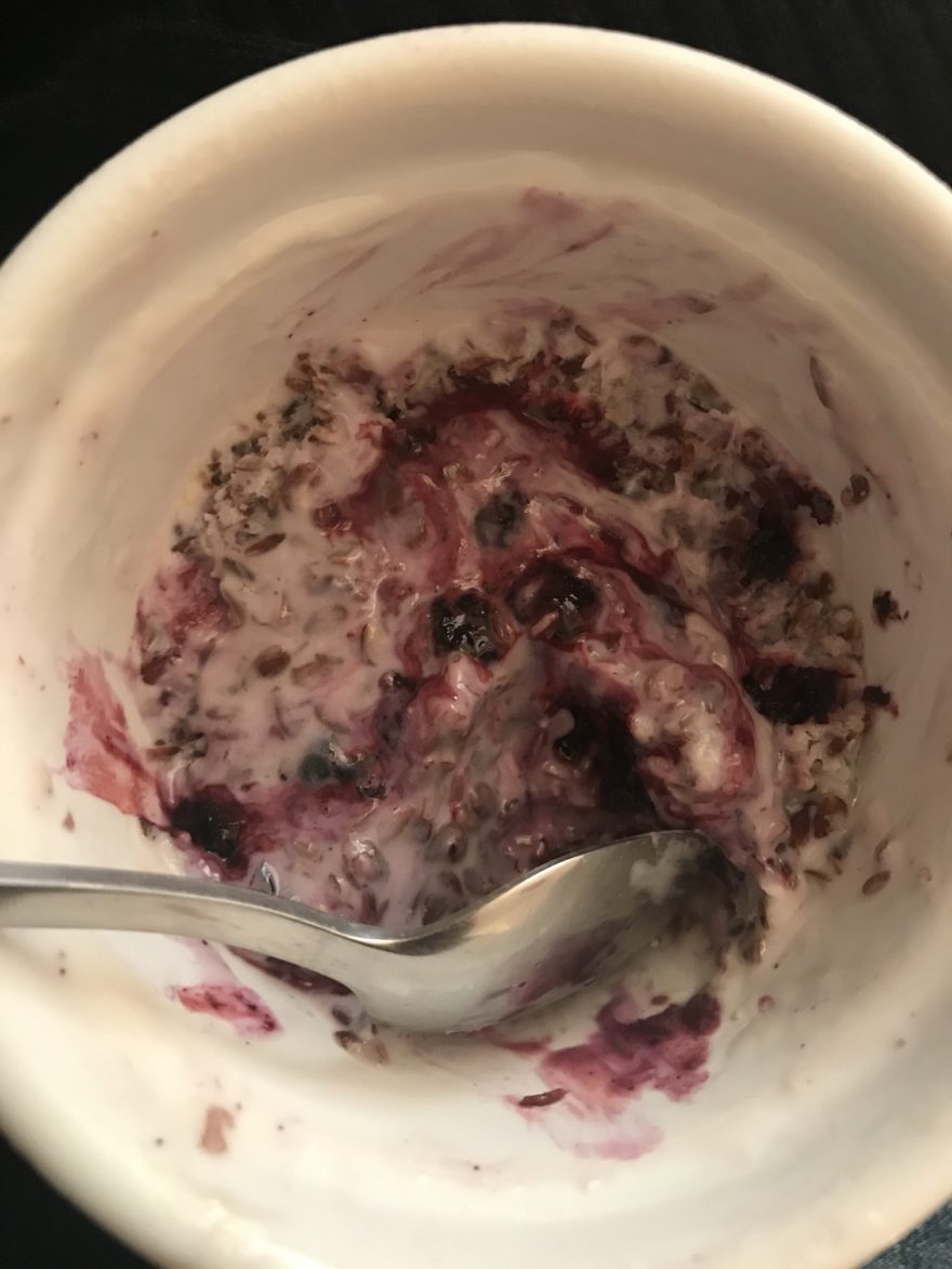 Ingredientes: yogur griego natural- 40 gr; Proteína de Vainilla Whey baja en endulzante – 10 gr; Linaza molida – 18 gr; Sal marina: 0,3 gr (una pizca); Aceite TCM (Triglicéridos de Cadena Media): 5 ml; arándanos – 15 gr.